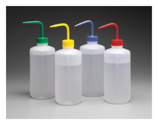 颜色标记的洗瓶,低密度聚乙烯瓶体;聚丙烯螺旋盖/杆和吸管,500ml容量,红色